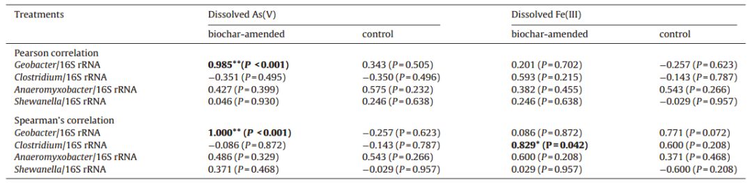在生物炭修正組中,地桿菌(geobacter)的轉錄水平與砷As(V)的釋放濃度顯著正相關(Pearson,R=0.98,p<0.001;Spearman,R=1,p<0.001),梭菌(clostridium)的轉錄水平與鐵Fe(III)的釋放濃度顯著負相關(Spearman,R = 0.829 ,P < 0.05)。由此可見,在生物炭修正的水稻土壤中,地桿菌(geobacter)和梭菌(clostridium)可以通過提高轉錄水平快速響應砷As(V) 和鐵Fe(III)的釋放。