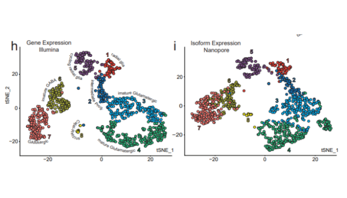 1141個細胞的Illumina基因表達(h)和納米孔轉錄本表達(i)的t-SNE圖[2]。