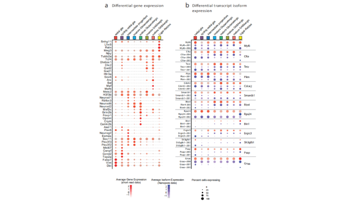 10×單細胞全長轉錄組測序利用ONT長讀長實時測序技術結合10X技術可以直接讀取反轉錄的全長cDNA,并進行快速分析。這樣能夠有效的獲取高質量的單個RNA分子的全部序列,準確辨別二代測序無法識別的同源異構體 (isoform)、同源基因、超家族基因或等位基因表達的轉錄本。