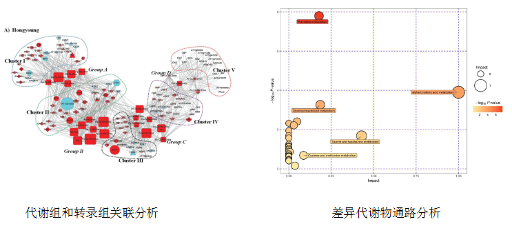 ??????生物體的表型由?DNA、RNA、蛋白質及代謝物等各個層面調控決定,mRNA?研究可以獲得樣本之間差異基因、復雜調控網絡,而基因與表型不能直接關聯,難以鑒定控制關鍵途徑的結構及調控基因,結合代謝組,輔助時序表達的眾多基因進行”共表達”分析,揭示基因功能,并將基因與表型關聯起來,快速鑒定核心調控網絡,確定關鍵候選基因。