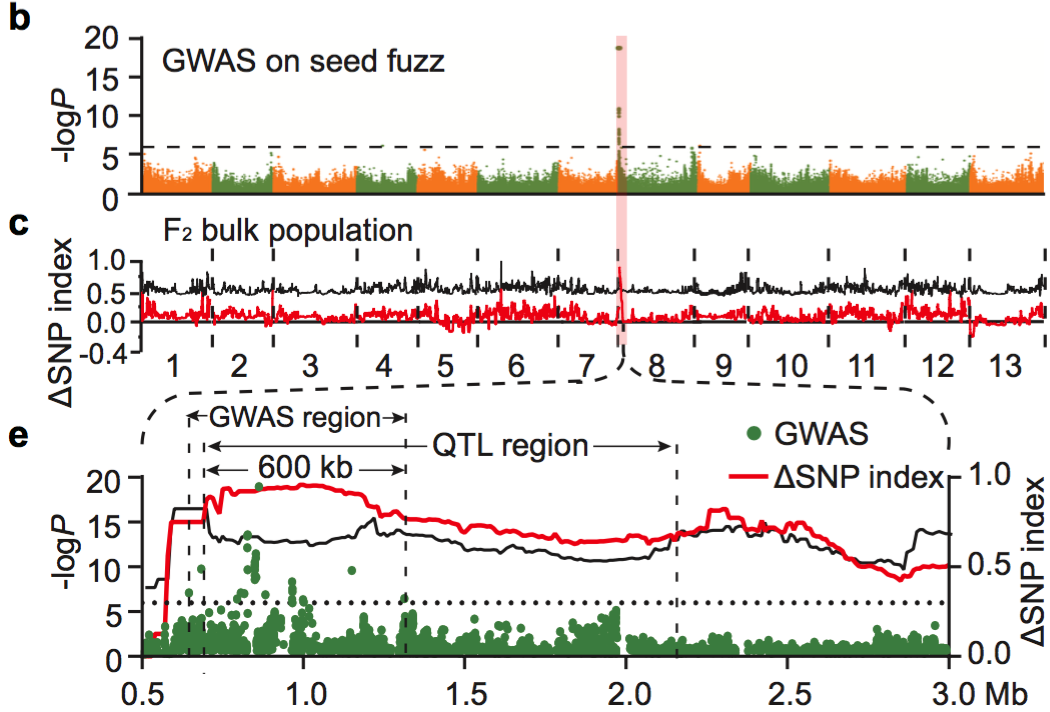 對來自不同環境下的11個重要性狀進行全基因組關聯分析,鑒定了亞洲棉11個重要農藝性狀的98個顯著關聯位點,GaKASIII的非同義替換(半胱氨酸/精氨酸替換)使得棉籽中的脂肪酸組成(C16:0和C16:1)發生了變化;發現棉花枯萎病抗性與GaGSTF9基因的表達激活相關。選擇了亞洲棉種質中的158份有絨毛和57份無絨毛材料進行GWAS關聯分析,發現與毛狀體和纖維發育有關信息(圖3)。