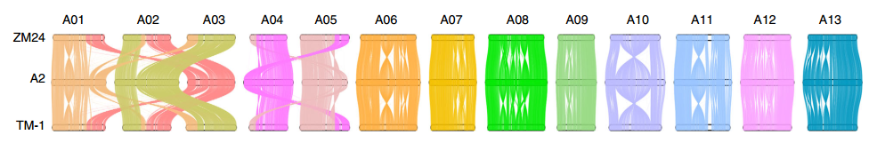 基于 Illumina、PacBio 、Hi-C和光學圖譜數據,組裝Arachis monticola(2n = 4x = 40)基因組大小為2.62 Gb ,contigs N50=106.66 Kb,scaffolds N50=124.92 Mb;與栽培四倍體花生A. hypogaea基因組結構變異高度保守,且比野生祖先二倍體更加保守;