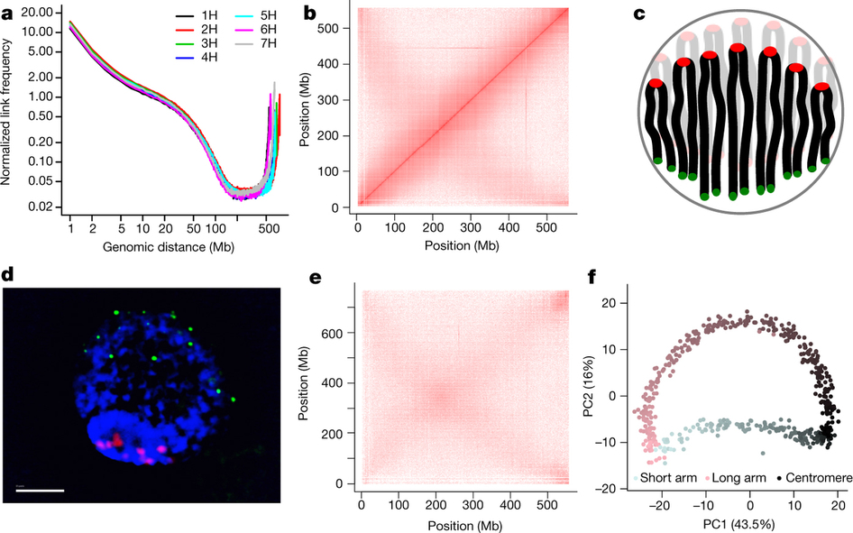 通過HIC熱圖作者發現無論是染色體內部還是染色體間的長短臂之間都存在較強的交互信號。按照HIC的原理來說,染色體上空間作用越強則實際DNA間的物理距離越近,染色體大小臂及不同染色體間的相互作用應該是極弱的。為了找出原因,作者通過對大麥葉核間期的細胞進行著絲粒及端粒熒光雜交,發現所有染色體的端粒和著絲粒在空間上的位置都純在極性,且排列方式也極其相似,不同染色體間的大小臂其實在空間上距離很近,因此確實存在染色體內外大小臂之間大量的交互作用的可能。