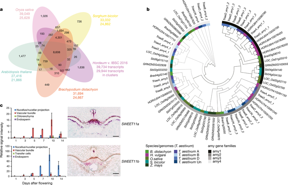 通過對大麥基因組進行基因家族收縮擴張分析發現,收縮擴張的家族中*顯著的部分都與植物防御及抗病相關。另外,作者對麥芽品質相關的amy家族及糖代謝相關的SWEET家族進行了亞家族分類,多倍化及表達模式相關的分析。