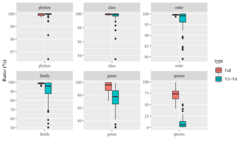 全長(zhǎng)微生物多樣性最主要優(yōu)勢(shì)為種水平注釋率高,三代測(cè)序技術(shù)可以實(shí)現(xiàn)多多個(gè)高變區(qū)進(jìn)行測(cè)序,能夠更為準(zhǔn)確的還原群落結(jié)構(gòu)。