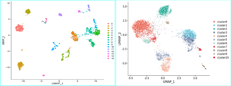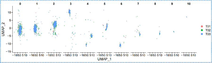 將相同的PBMC細胞懸液分3份,通過3個不同實驗人員,用3臺百創DG1000儀器,獨立進行單細胞測序,得到了幾乎一致的細胞聚類分群結果,證明百創DG1000具有很好的可重復性及穩定性。