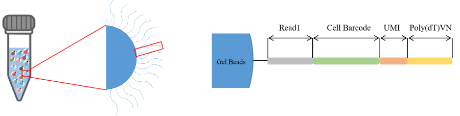 種類約為88萬種,每個膠珠之上有千萬級的探針,每條探針包括四個部分,通用測序引物R1,cell barcode,UMI,poly(dT)VN ,這里我們設計了更長的CB有54個bp,更長的CB可以更好的去兼容三代測序,尤其是ONT測序,可以提升識別效率。
